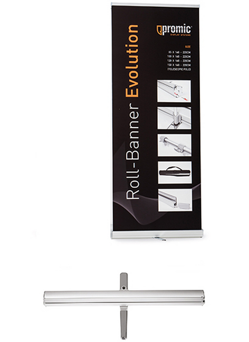 Das Roll Up Evolution hat eine sehr robuste Kassette aus Aluminium und verchromtem Stahl. Durch den externen Stangenhalter wird eine hohe Standfestigkeit und Gradlinigkeit des Bannersystems erreicht. Eine Teleskopstange mit "Easy-Clip System" ermöglicht einen einfachen Aufbau mit einer variablen Höhe zwischen 175 und 215 cm. Die Breite beträgt 85 cm. Das Evolution wird mit blickdichter Folie bestückt und in einer verstärkten Tasche mit Innenfutter ausgeliefert. Beachten Sie bitte die Dateivorgaben