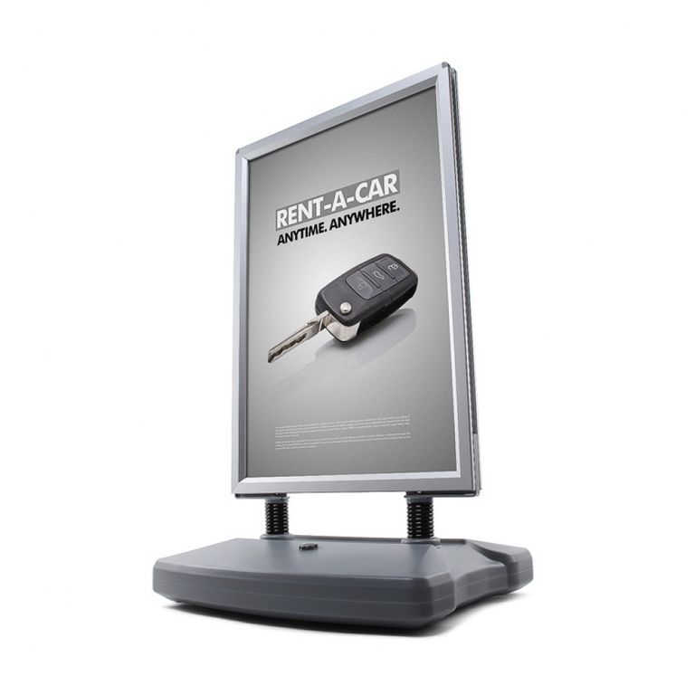 Speziell für Ihre Werbung in windigen Bereichen ist der Kundenstopper WINDTALKER® von CopyWorld in Nürtingen die optimale Lösung. Sein mit Wasser oder Sand befüllbarer Standfuß bietet in Verbindung mit den Spezialfedern aus Stahl eine hohe Standfestigkeit. Für den einfachen Transport sind im Standfuß Rollen integriert. So können Sie den Kundenstopper trotz des Standgewichtes einfach bewegen. Der Aluminium-Schnellwechselrahmen kann doppelseitig mit Plakaten bestückt werden und garantiert Ihnen auch bei hohen Windstärken eine auffällige Werbemöglichkeit.